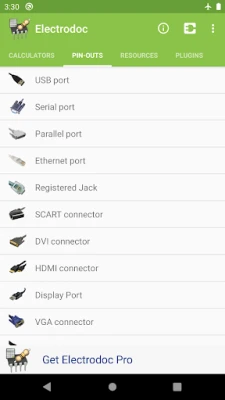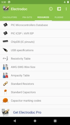 Bayan waɗannan kayan aikin, Electrodoc yana aiki a matsayin taskar albarkatun ilimi. Ya haɗa da bayanan PIC ICSP / AVR ISP, ChipDB don gano pinouts na IC, teburin ƙimar wutar lantarki (Resistivity Table), girman waya (AWG-SWG Wire Size), alamar capacitors, alamun zane na lantarki, da teburin ASCII. Ga masu neman ƙarin ci gaba, sigar Pro tana ba da gogewa ba tare da tallace-tallace ba tare da ƙarin fasali masu ban mamaki. Wannan ya haɗa da sabbin masu lissafi kamar Zener Diode, juyawa Y-Δ, da kuma masu canza Decibel da RMS. Haka kuma, akwai ƙarin tsarin haɗi na musamman kamar Raspberry Pi, SD card, SIM/Smart card, da kuma JTAG. Sigar Pro tana inganta wasu masu lissafi kuma tana ba da damar tsara jerin kayan aiki yadda kuke so. Bugu da ƙari, Electrodoc yana goyan bayan ƙarin kayan aiki (plugins) don fadada ayyukansa, kamar bayanan micro-controllers na PIC da AVR, masu kwaikwaya, da kuma neman sassan lantarki.