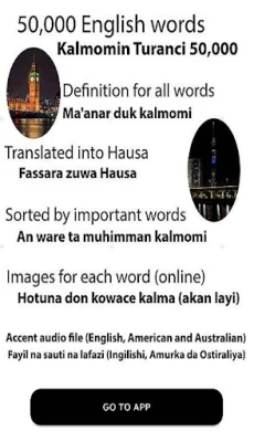 English hausa dictionary shine ƙamus na musamman mai kalmomin Turanci dubu 50, tare da hotuna da ma'anoni. Ya haɗa da furuci na Amurka, Australiya, da Biritaniya. Samu misalai, bayani, da kuma fassara kalmomi cikin sauƙi.