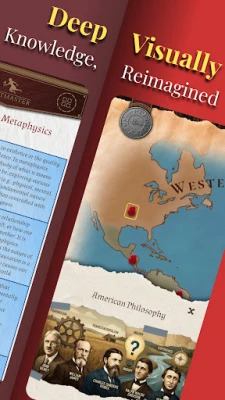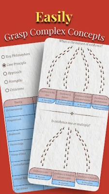 Domin sauƙaƙe fahimtar falsafa, Noesis: Philosophy ya wadatu da kayan taimako na gani. Misali, akwai zane-zane na bayani da teburin kwatance don fahimtar ra'ayoyi masu sarkakiya a fannonin Epistemology, Ethics, Politics, da Metaphysics. Don gwada iliminka da tunawa da abin da ka koya, an haɗa sassan koyo na mu'amala. Ka gwada basirarka da Falsafa Quiz na ƙarshe wanda ke da tambayoyi sama da 2000, ko Term Puzzle mai kalmomi sama da 500, da kuma True/False Challenge. Idan ba ka da tabbacin inda za ka fara, Noesis: Philosophy yana da jagororin koyo da suka haɗa da jerin littattafai masu mahimmanci guda 200 da aka zaɓa, da kuma taswirar hanya (roadmaps) da aka tsara don jagorantar tsarin koyonka. An tsara duk abun cikin Noesis: Philosophy da kyau, yana samuwa gaba ɗaya offline, kuma an rarraba shi bisa matakan ilimi daban-daban don samar maka da kwarewar koyo mai daɗi da kuma amfani.
