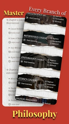 Noesis: Philosophy yana ba da tarin darussa na falsafa cikakku. Ka manta da neman bayanan da suka tarwatse; anan za ka samu sa'o'i na kayan koyo da aka tsara don jagorantarka daga matakin farko zuwa matakin gwani. Waɗannan sun haɗa da Falsafa 101 ga masu farawa, Darussan Metaphysics don gano yanayin gaskiya da wanzuwa, Epistemology don fahimtar iyakoki da yanayin ilimin ɗan adam, Ethics don nazarin halayya da ɗabi'a, da Political Philosophy don nazarin adalci da shugabanci. Bugu da ƙari, akwai rumbun adana bayanai masu yawa da suka haɗa da jerin lokutan masu falsafa sama da 200, daga Socrates zuwa Nietzsche, tare da tarihin rayuwarsu da dubban maganganu masu muhimmanci. Har ila yau, za ka samu jerin lokutan ra'ayoyin falsafa kamar Stoicism da Existentialism, taswirar duniya ta al'adun falsafa, da kuma ƙamus mai faɗi na kalmomin falsafa sama da 600.